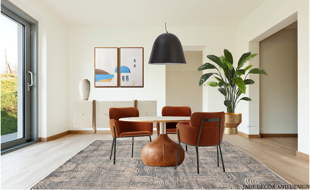 I decided to continue the same color scheme in the dining room and the wow piece here is the incredible table. I love the shape and the leather detail at the bottom, ooo la la!