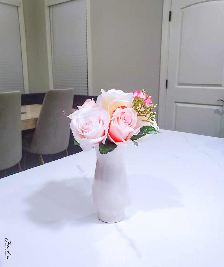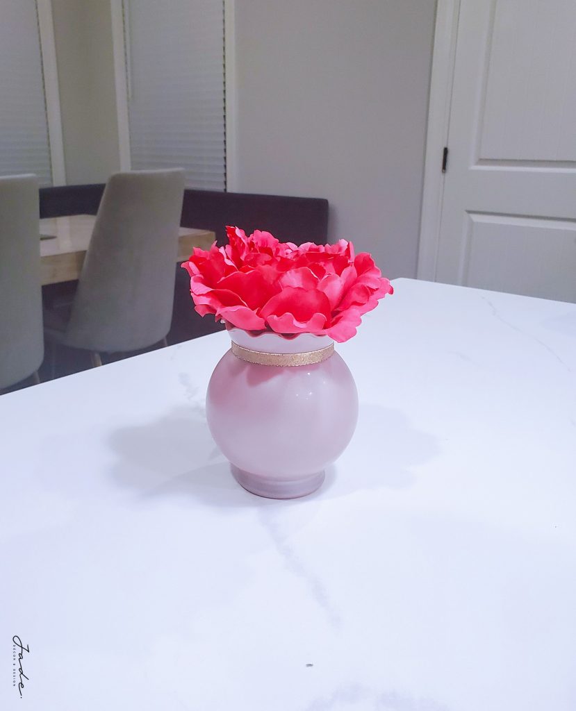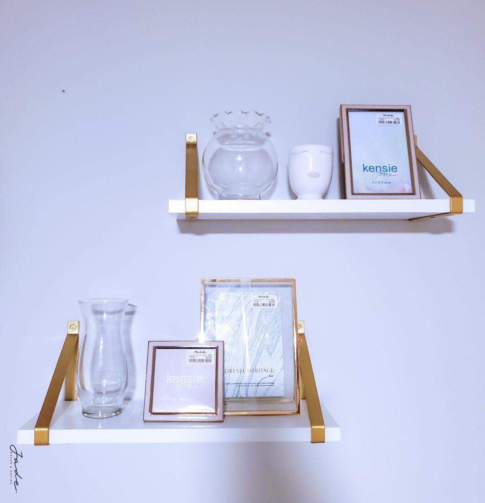 Next up was styling the shelves. I put up a few picture frame combinations to decide which color and size would work for the space while leaving room for the painted vases. I really love the combination of muted pink and a more vibrant pink for the vases and flower arrangements. I haven’t decided what to put in the frames yet. I want something that would have an impact from afar since the frames are so small.