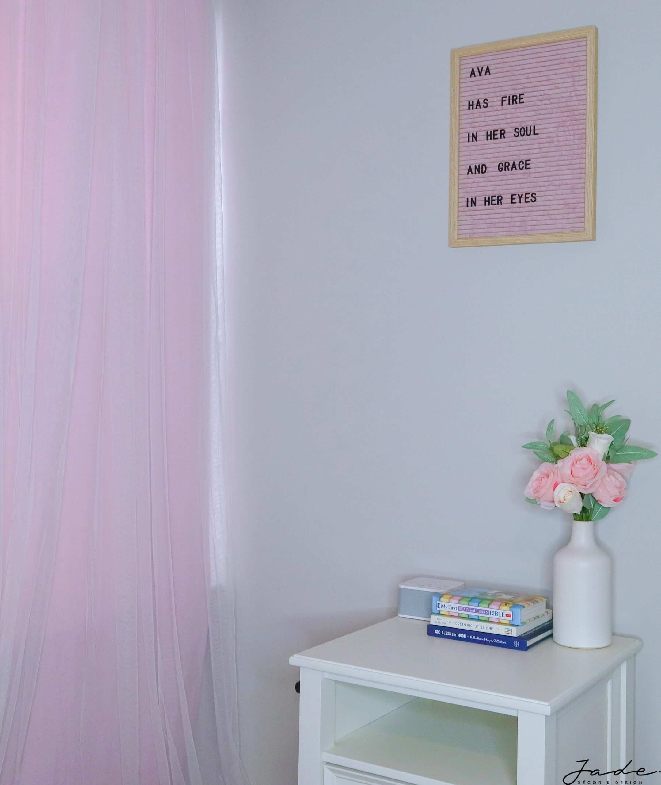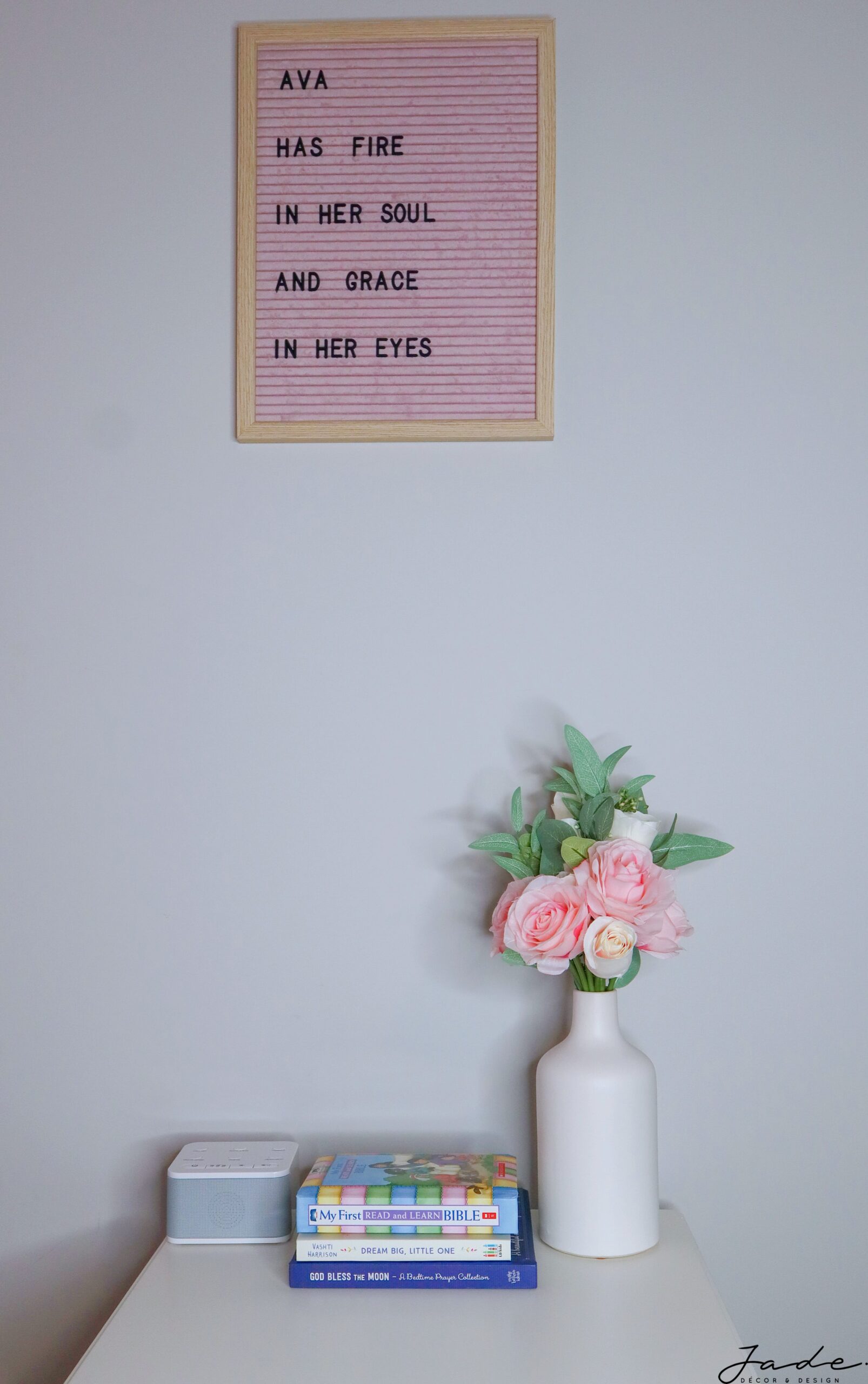 I was initially going to put her glider in the spot beside the window, but I changed my mind when I had all the furniture in place. It looked better and more functional beside her bed. I stumbled on this letter board and I especially loved the fact that I could change the wordings to whatever I want, whenever I want (limited to how many letters are available of course, but you get my drift :).