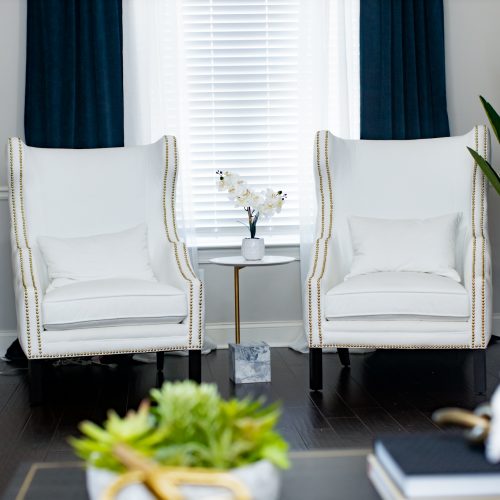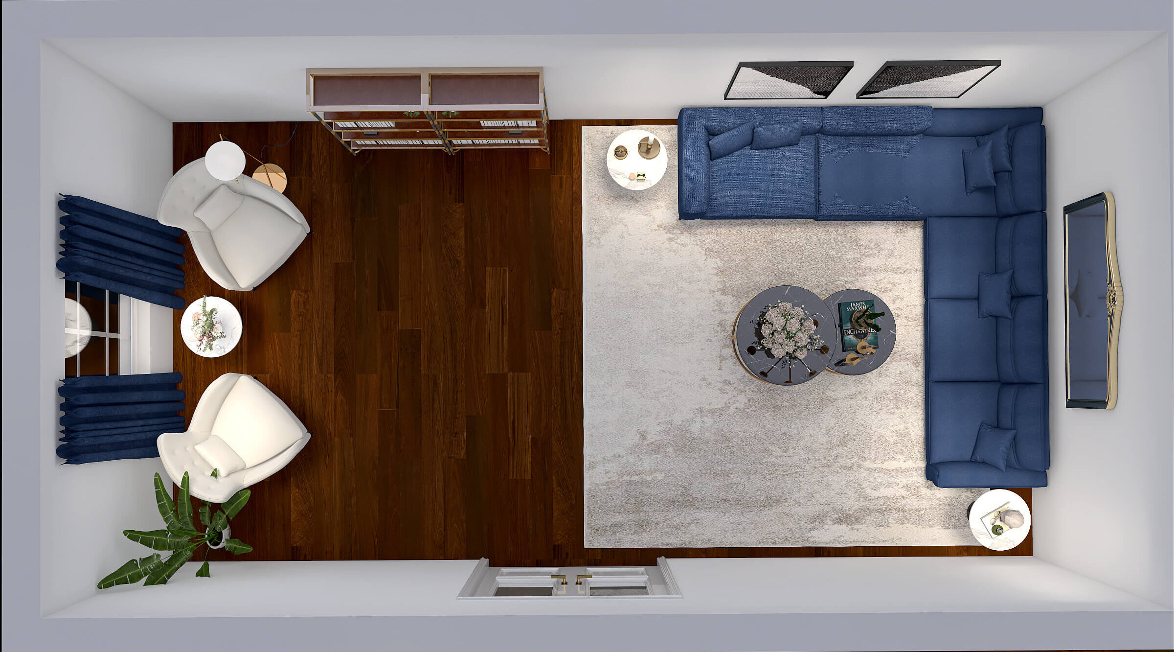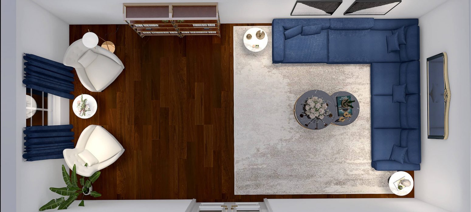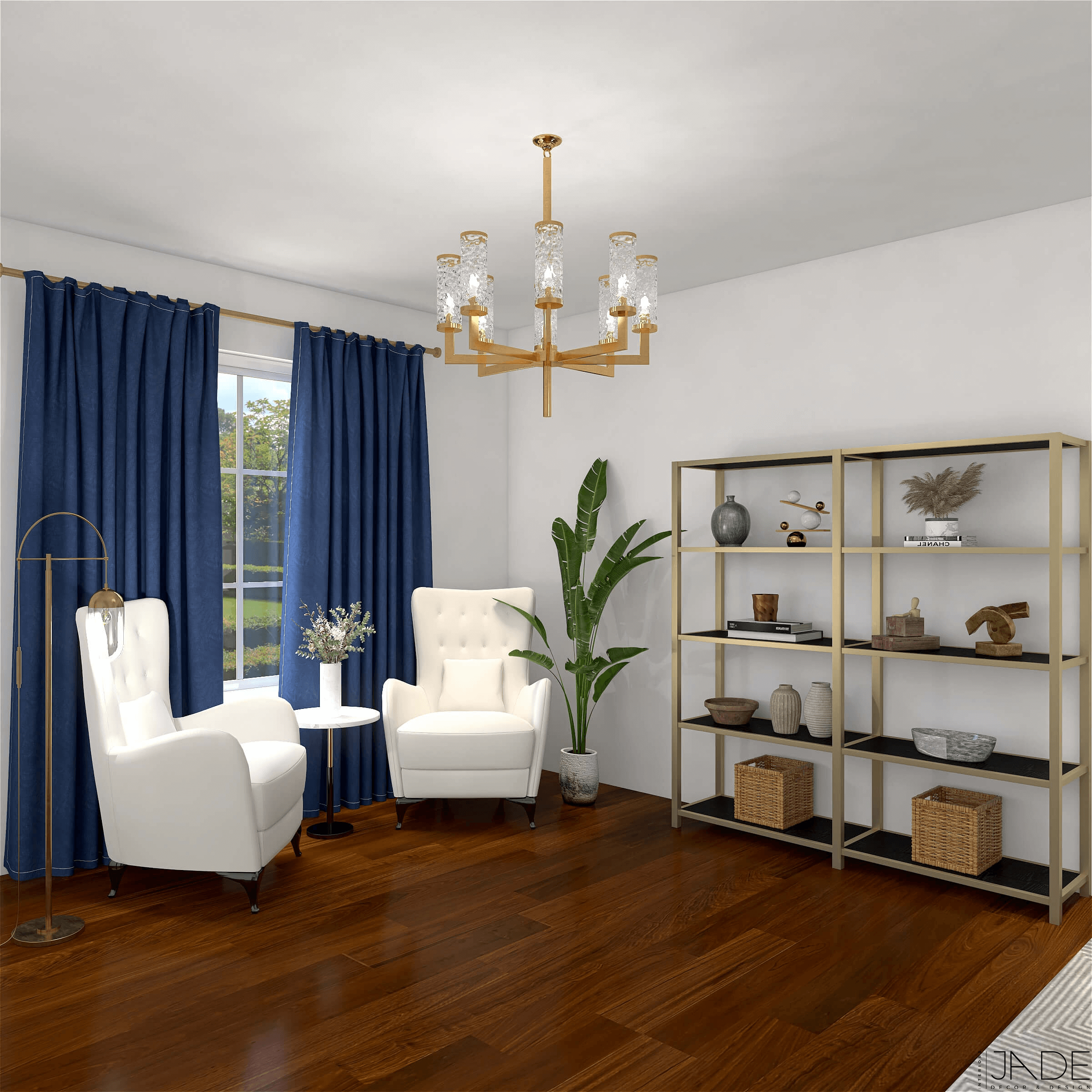 With the main furniture pieces in this room already secured, the task was to complete the room with decorative items. In order to fully conceptualize the look, the space was rendered to scale and designed to put the finishing touches. The rendered designed set a good foundation to begin sourcing and we knew the exact furniture / decor pieces to purchase.
